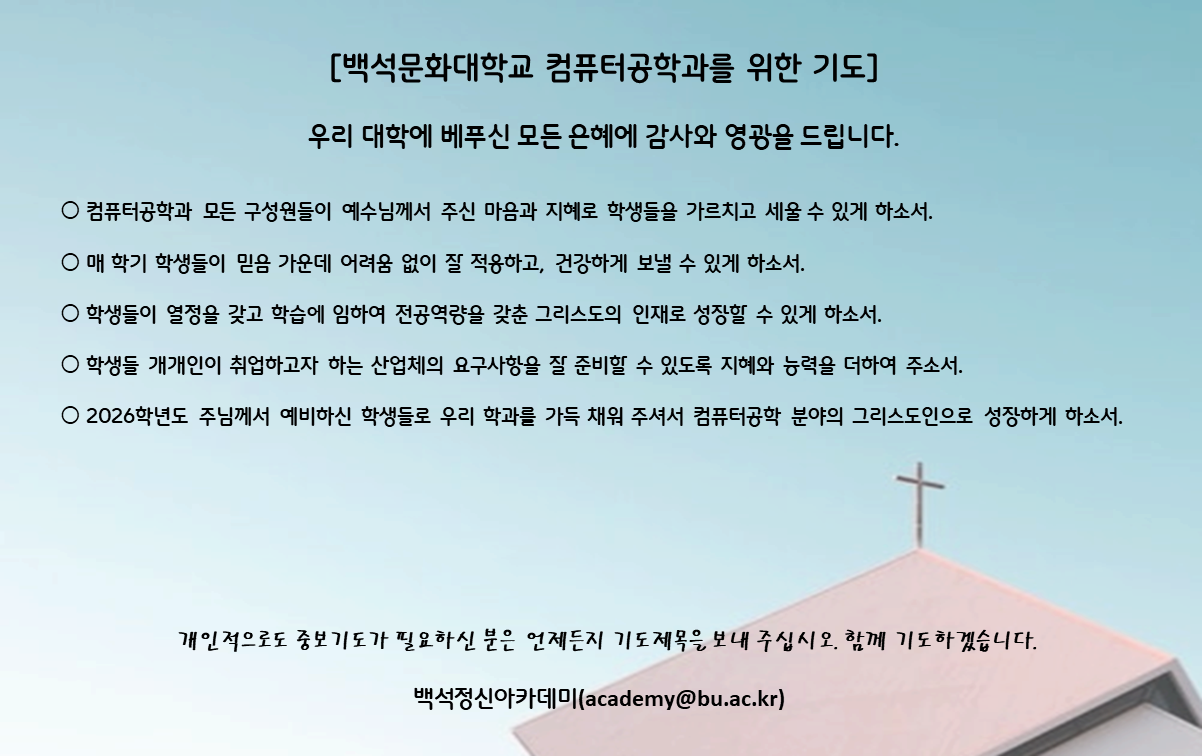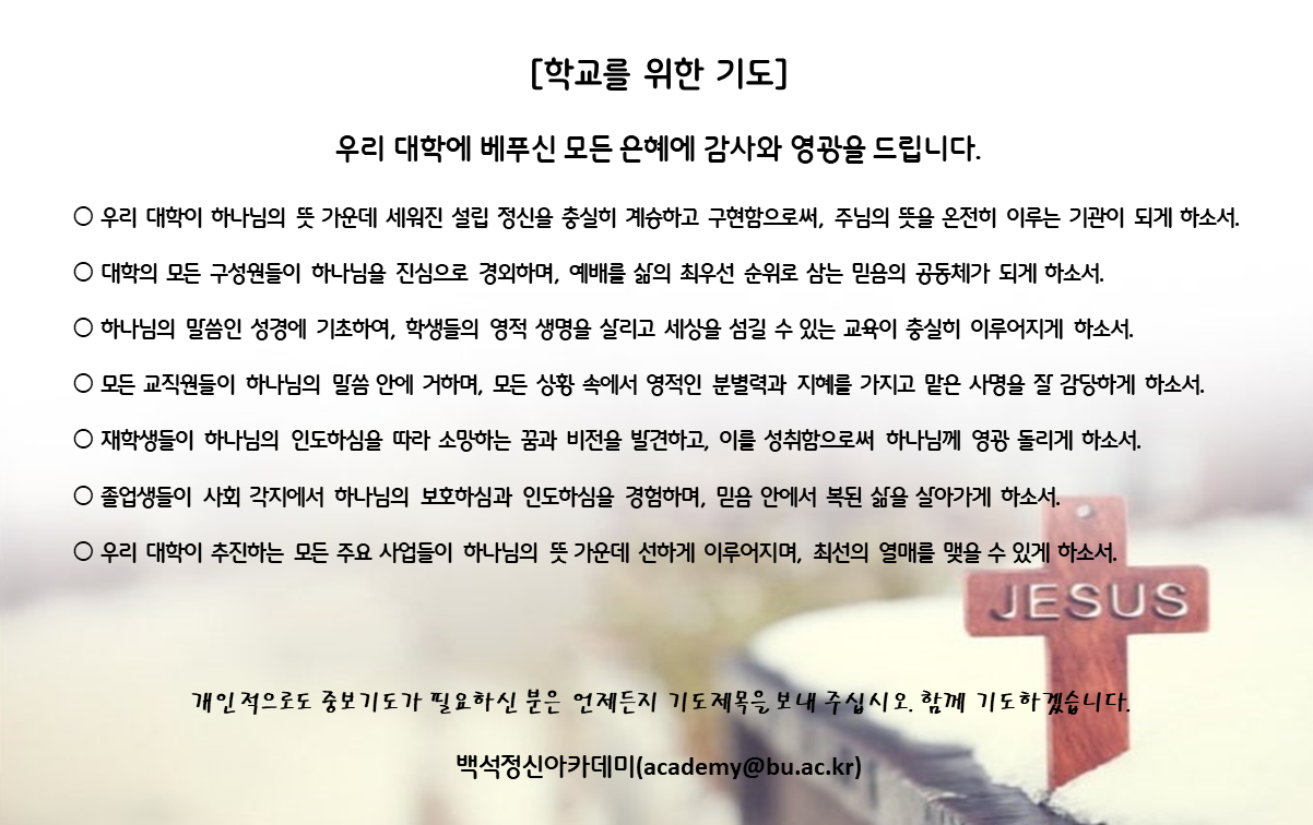 fnctId=mainNotice,fnctNo=0 글번호 30189 작성일 2025.11.07 작성자 백석정신아카데미 조회수 285 우리대학과 학부(과)를 위한 기도입니다. 함께 기도해 주세요.