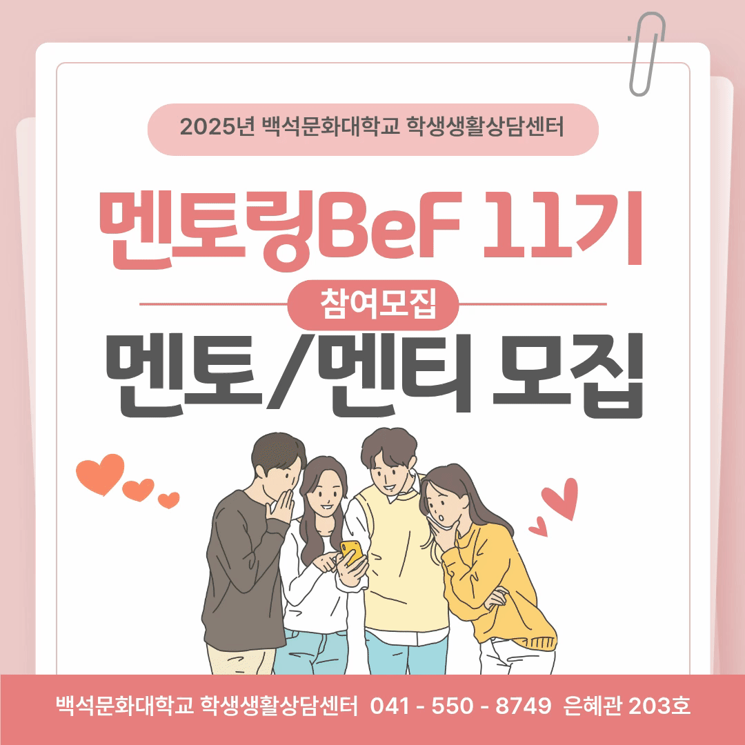 BeF 멘토링은 선배와 후배와의 멘토링을 통해 신입생들의 대학생활을 빠르게 적응하고, 다양한 노하우를 전수받기 위한 멘토링 프로그램입니다.