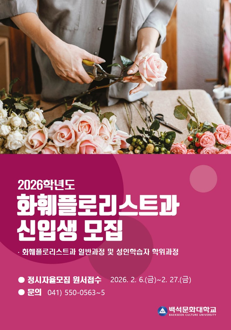 백석문화대학교 화훼플로리스트과에서는 2026년 2월 6일(금)부터 2026년 2월 27일(금)까지 2026학년도 정시자율 모집을 진행합니다.