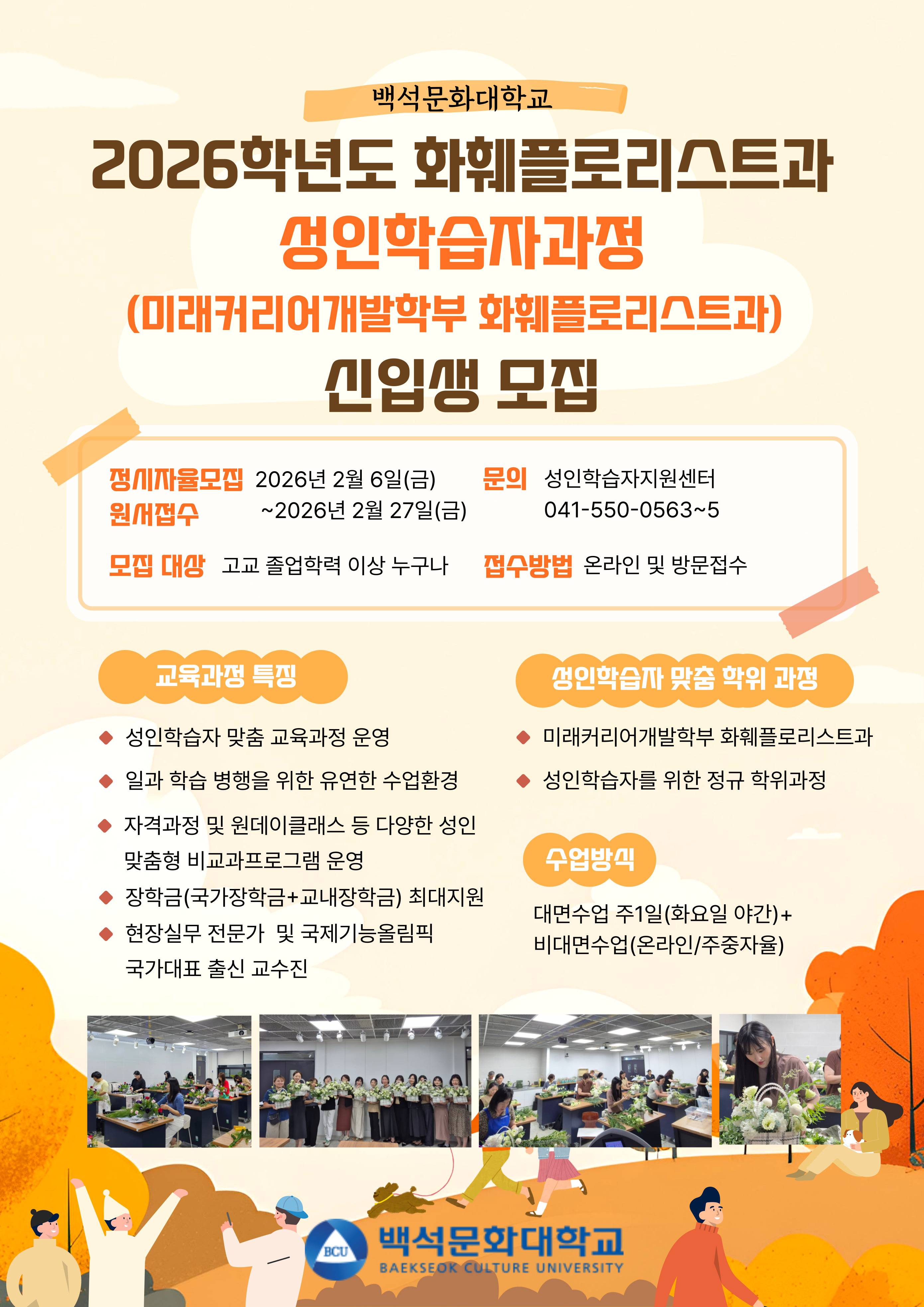 백석문화대학교 화훼플로리스트과에서는 2026년 2월 6일(금)부터 2026년 2월 27일(금)까지 2026학년도 성인학습자과정 신입생 정시 자율모집을 진행합니다.