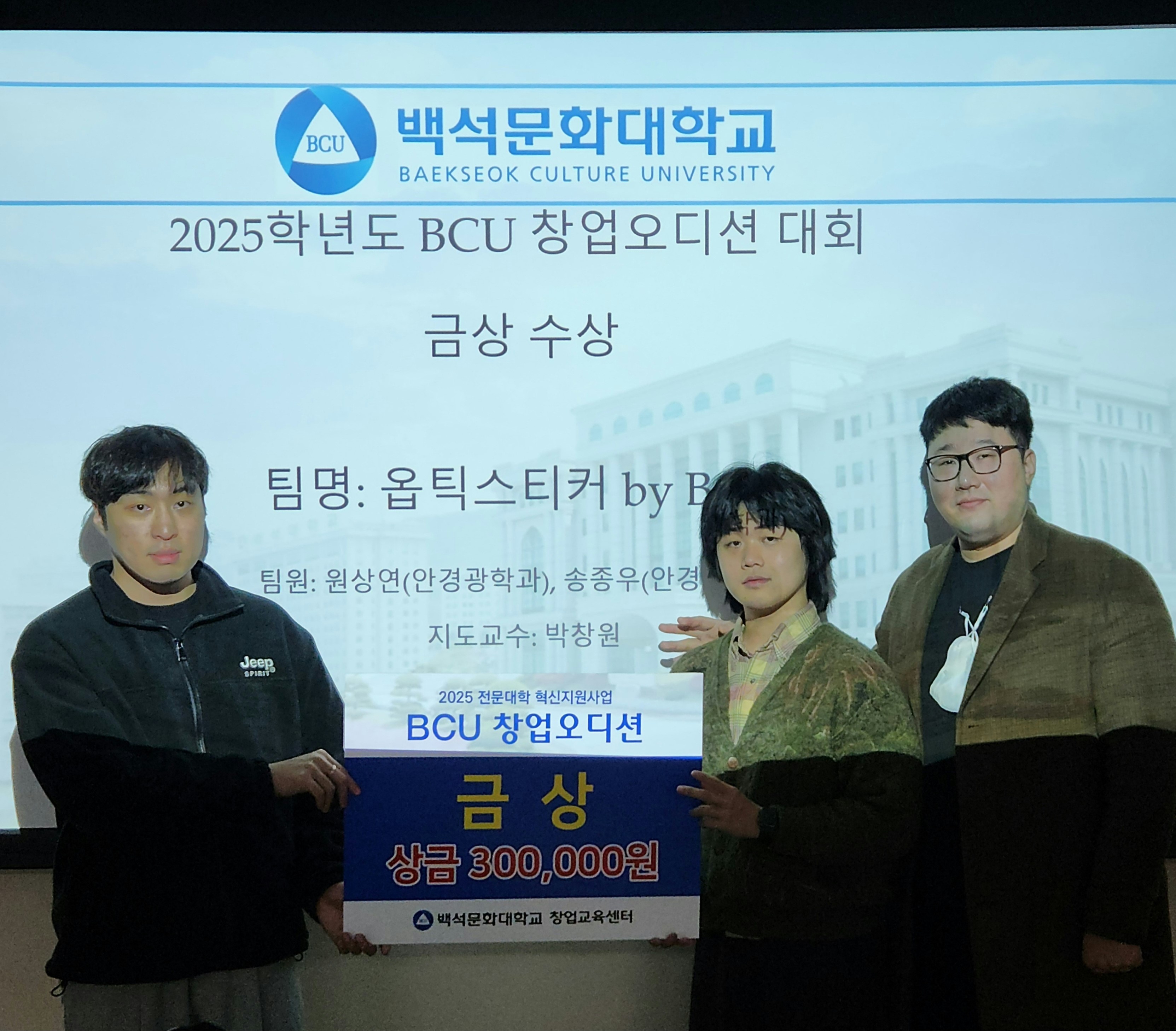 창업동아리 회원인 옵틱스티커 by BCU 팀이 금상을 수상했습니다.