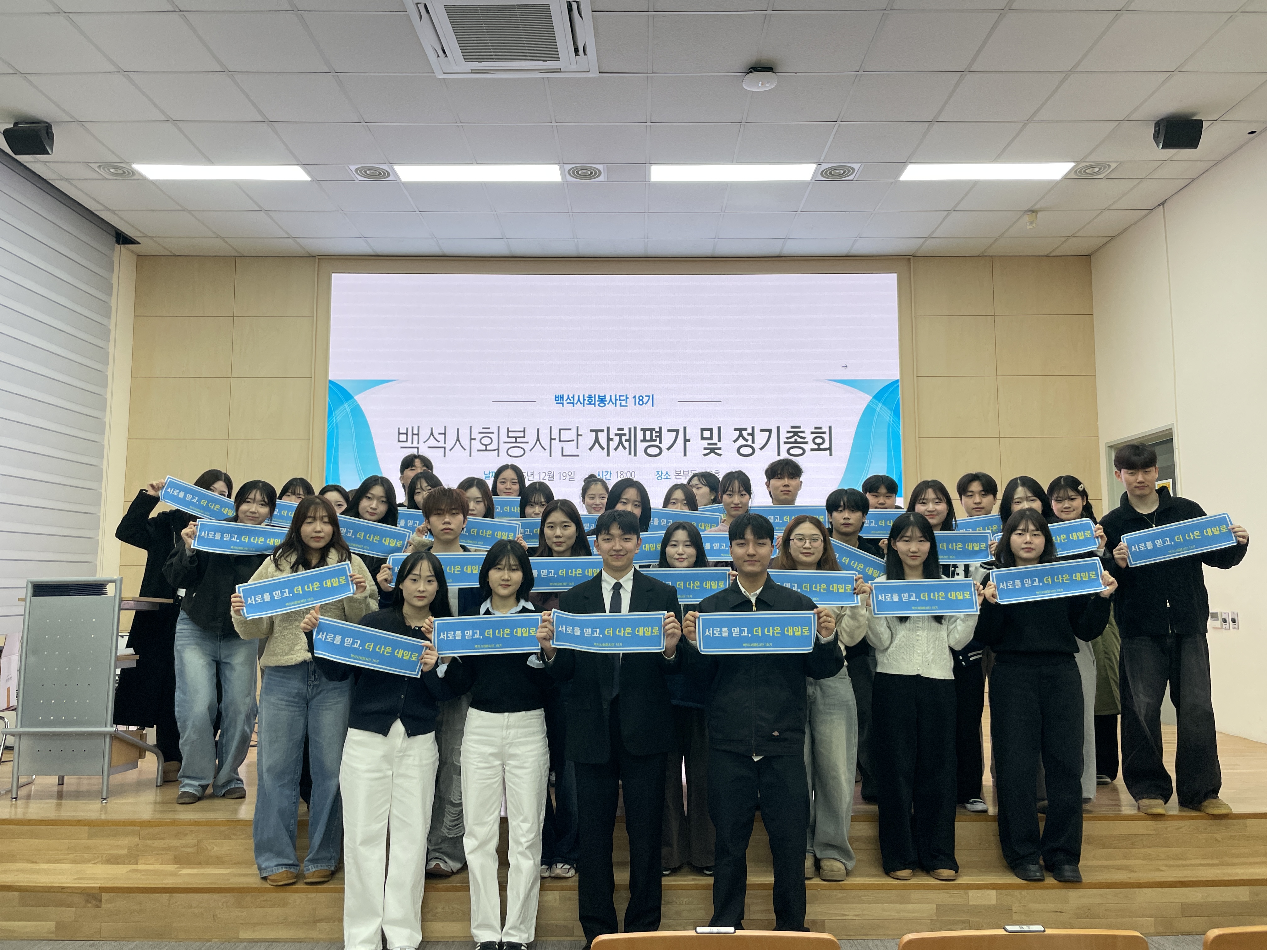 2025년 12월 19일, 백석대학교 본부동 103호에서 백석사회봉사단의 자체 평가 및 정기총회가 진행되었다. 이번 총회에는 18기 단원 전원이 참석하여 올 한 해 동안의 활동을 돌아보고, 향후 봉사단을 이끌어갈 내년 임원진을 선출하는 시간을 가졌다.