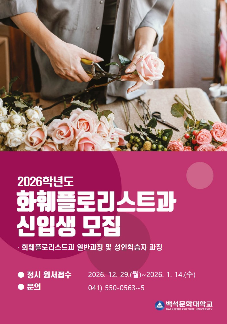 백석문화대학교 화훼플로리스트과에서는 2025년 12월 29일(월)부터 2026년 1월 14일(수)까지 2026학년도 정시모집을 진행합니다.