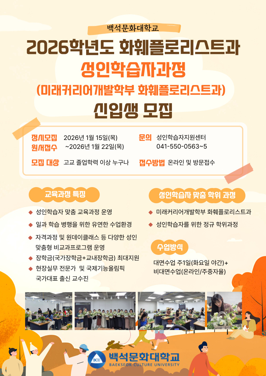 백석문화대학교 화훼플로리스트과에서는 2026년 1월 15일(목)부터 2026년 1월 22일(목)까지 2026학년도 성인학습자과정 신입생 정시 2차 모집을 진행합니다.