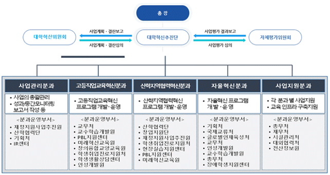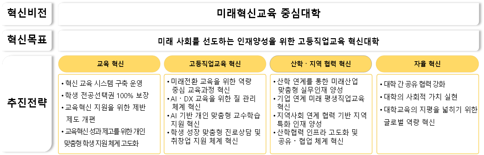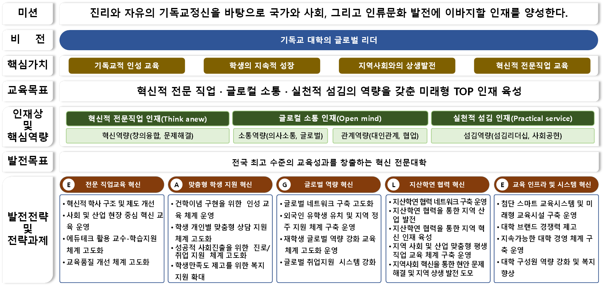 전문대학 혁신지원사업 목표 우리 대학의 교육목표는‘혁신적 전문 직업ㆍ글로컬 소통ㆍ실천적 섬김의 역량을 갖춘 미래형 TOP 인재육성’으로 미래사회 산업현장에서 타인과 협업하며, 혁신적이고 창의적인 능력을 발휘하는 전문직업인으로서 역할을 할 수 있는 인재를 양성함 3주기 혁신지원사업 목표 추진전략 대학 전체 차원의 사업추진을 위한 대학혁신추진단을 총장 직속으로 구성ㆍ운영 전문대학 혁신지원 사업 추진과 관련된 모든 부서를 추진단 산하 5개 분과로 구성ㆍ운영