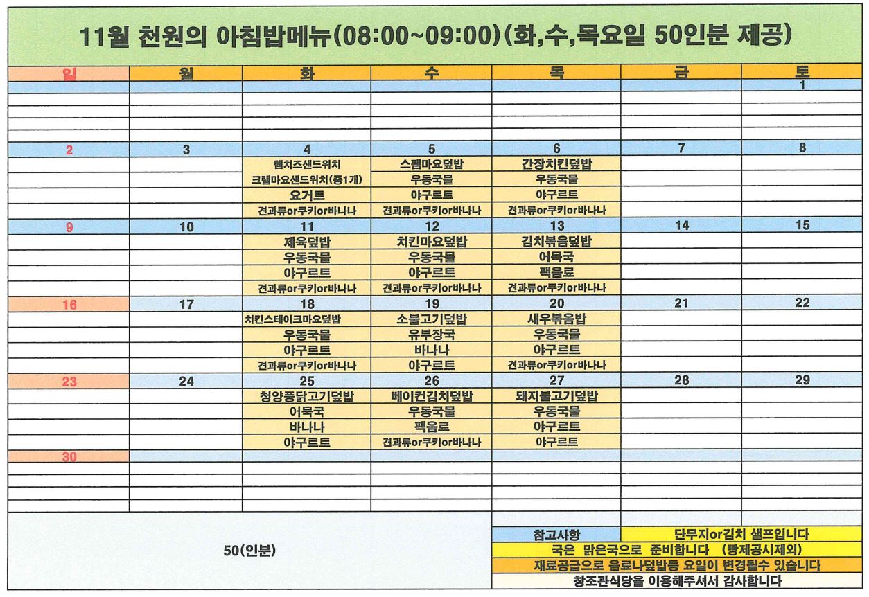 fnctId=bbs,fnctNo=520 단축 url 작성일 2025.10.30 작성자 학생취업진로지원처 조회수 73 2025년도 11월 천원의 아침밥 식단표 첨부파일 11월 천원의 아침밥 식단표.pdf 다음글 주식회사 에몬스가구_2026년 에몬스 장학생(18기) 모집에 따른 홍보 협조 요청 건 이전글 강화군_2025년도 하반기 강화군 대학생 등록금 지원사업 홍보 요청